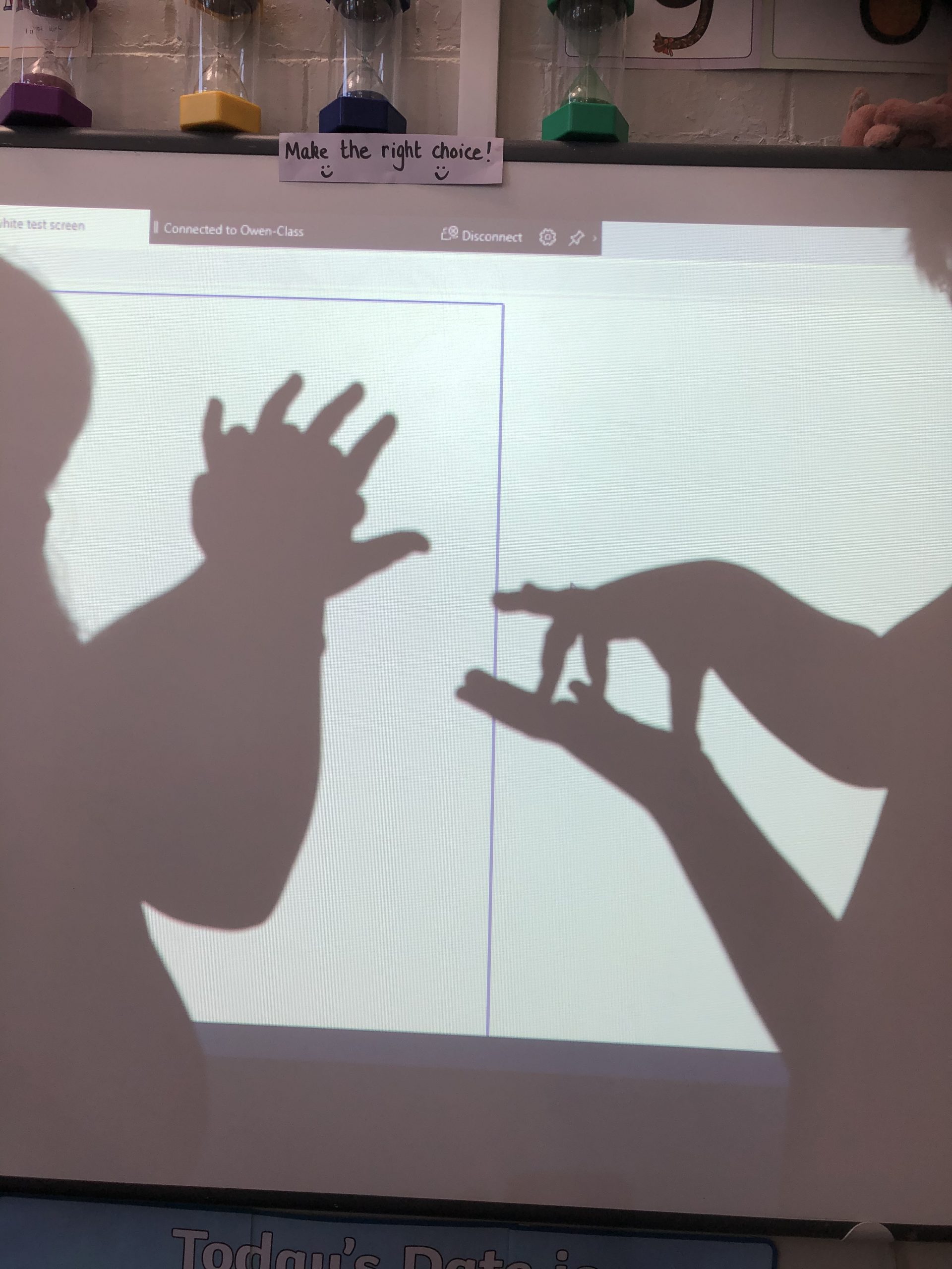 On Thursday, the children of key workers in school were very busy. Firstly they made shadow animals and flowers with their hands. They then created two aeroplanes each, one out of card and one out of paper in order to see which flew better – to make the experiment fair we made sure both planes were the same designs.